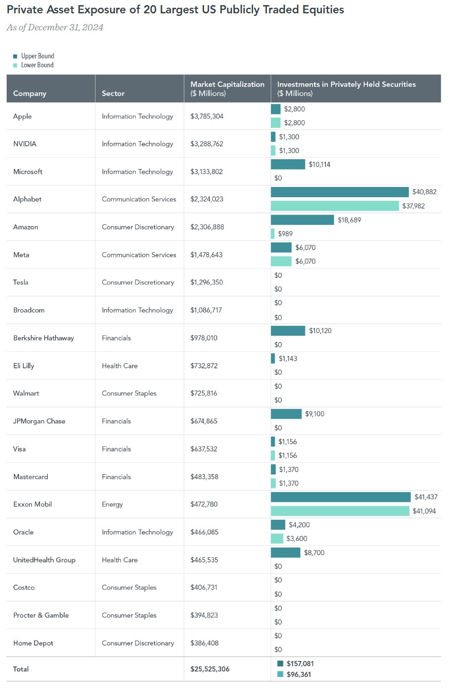 Finding a precise answer is impossible, but a report from Dimensional Fund Advisors has tried to estimate the amount using public companies’ accounting statements. Their estimate indicates that, out of the $25 trillion invested in the 20 largest US stocks, investors have about $100–$150 billion in exposure to private investments.